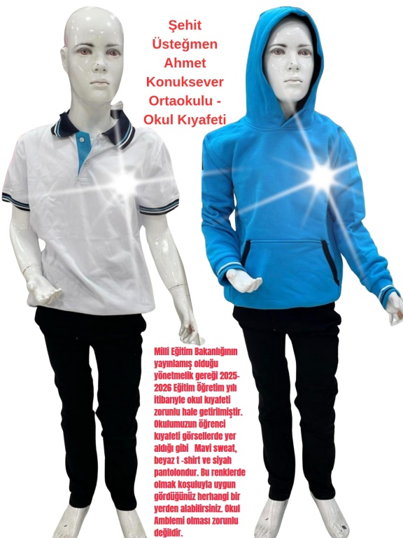 Milli Eğitim Bakanlığının yayınlamış olduğu yönetmelik gereği 2025-2026 Eğitim Öğretim yılı itibarıyle okul kıyafeti zorunlu hale getirilmiştir. Okulumuzun öğrenci kıyafeti görsellerde yer aldığı gibi mavi sweat, beyaz t -shirt ve siyah pantolondur. Bu renklerde olmak koşuluyla uygun gördüğünüz herhangi bir yerden alabilirsiniz. Okul Amblemi olması zorunlu değildir.