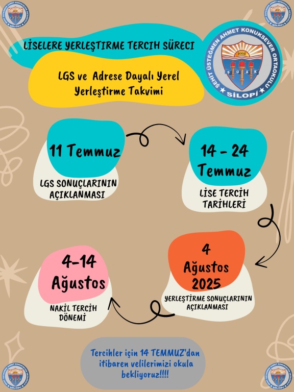8.sınıf öğrencilerimiz için Liselere geçiş tercih süreci ile ilgili takvim açıklanmıştır. Öğrencilerin tercih işlemlerini yapmak üzere, 14 Temmuz-24 Temmuz tarihleri arasında velilerimizi okulumuza bekliyoruz.