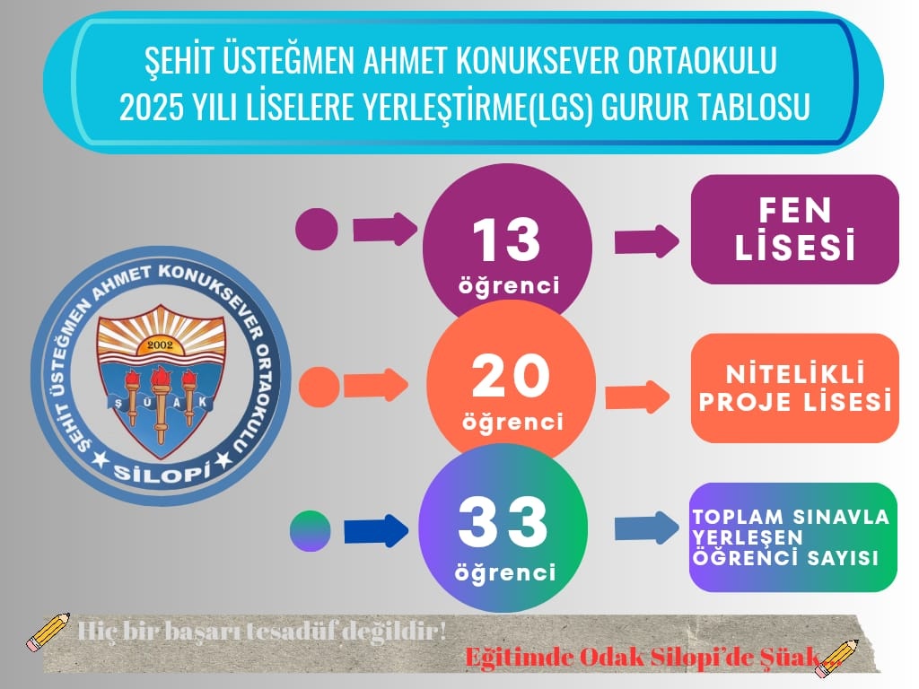 Okulumuz 2025 LGS sınavında büyük bir başarı elde ederek; 13 öğrencisini Fen Liselerine, 20 öğrencisini proje okullarına olmak üzere sınavla öğrenci alan liselere toplam 33 öğrenci yerleştirmiştir.